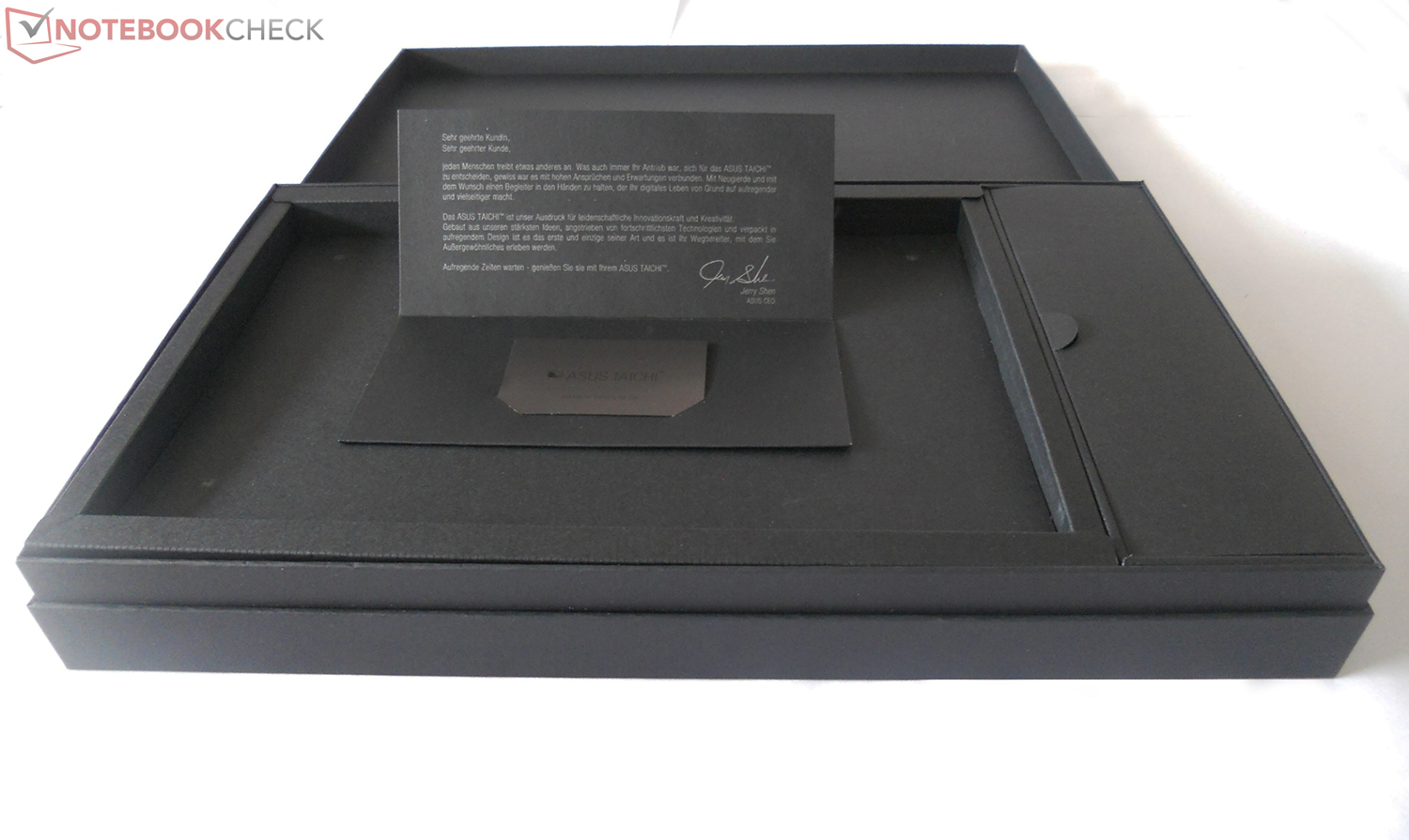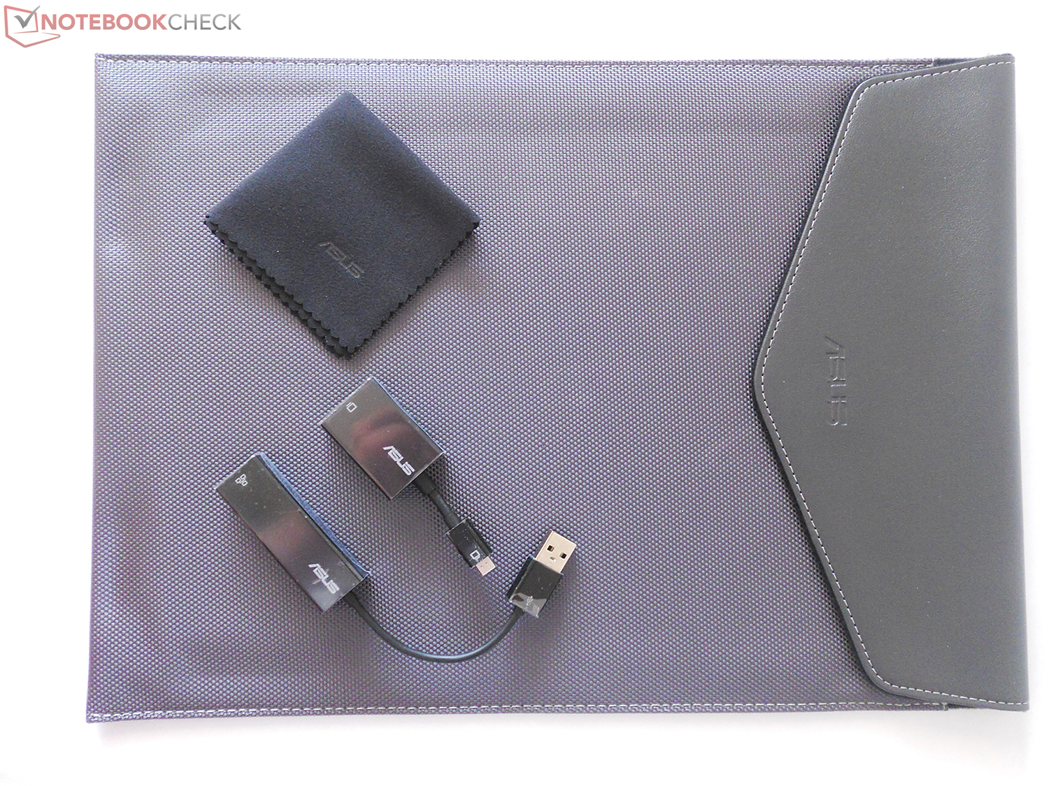 To make it short: Exemplary! Besides the product's first-rate debut in an elegant black box, the accessories are also compelling. The equipment included for the Asus Taichi 31-CX003H is known from the Zenbook product line and encompasses a seemingly high-quality, artificial leather laptop sleeve for secure transportation and two dongles (USB to network-LAN, mini-VGA to VGA) besides the compulsory PSU, a short user's manual, the warranty leaflet and a microfiber cloth. We only missed a third dongle for the micro-HDMI port.
