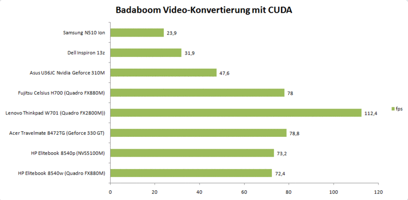 At least the CUDA engine has a significant advantage in video converting. With the right program, such as Badaboom from Elemental, converting can be passed on to the graphics chip and thus still has enough system reserves for "normal" work left over. When the same task is managed by the CPU, the computer is usually busy with this task for a longer period and occupied. The Geforce 310M achieves 47.6 fps while converting our DVD test video into an iPhone compatible format (H.264, 427x320).