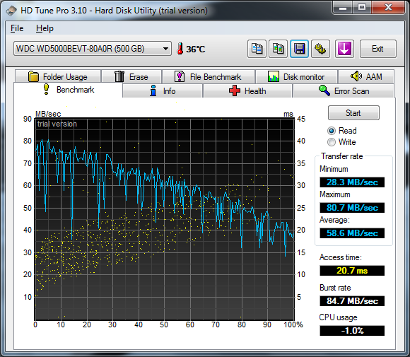 The mass memory, WD5000BEVT, installed in the test model comes from Western Digital and has a capacity of 500 GB. This is a lot of room for data, media and programs. The 2.5" drives works with 5400 rpm and is, in view of performance, in the lower midfield of current notebook hard disks. With an average transfer rate of 59 MB/s and access times of over 20 ms, it won't be able to tackle everything. For more information see our comprehensive HDD benchmark table. This could be improved with a faster conventional hard disk or a solid state drive. Since Asus currently doesn't offer any alternatives, you would have to take care of this upgrade yourself.