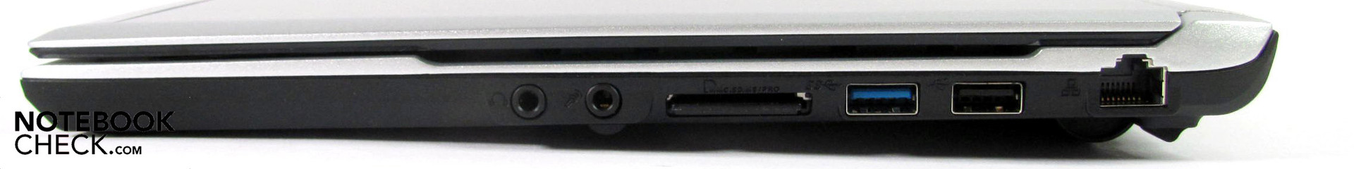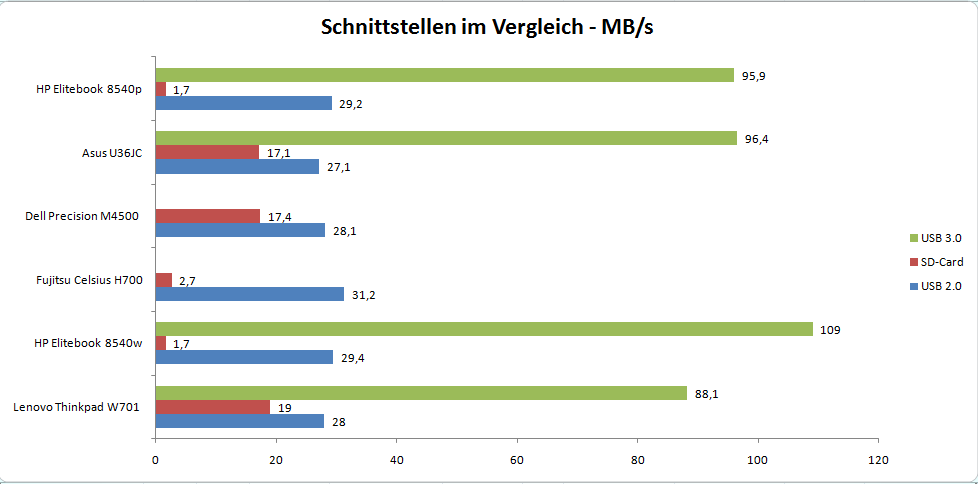 The Asus U36JC is not a connectivity miracle, but you'll find everything that is really required. A digital video out, HDMI in this case, provides for a perfect picture quality on external monitors and TVs. External (USB 3.0) hard disks can be connected via USB 3.0 and data is thus transferred a lot faster than via the two installed USB 2.0 ports. USB 3.0 delivered 96.4 MB/s and the USB 2.0 27.1 MB/s in the test. The cardreader, which supports most formats, achieved the standard 17.1 MB/s with a SDHC memory card. Apart from that, you'll find audio in/out, gigabit LAN and an additional analog VGA out (provides a good picture in 1280x1024). There is no optical drive.