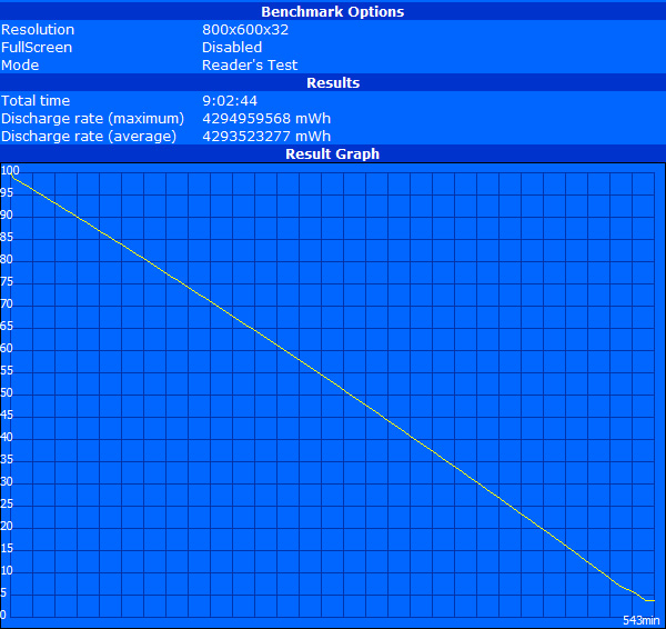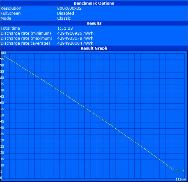 Then again, it looks slightly different in practical use. A touch of more brightness, enabled WLAN and surfing on the internet cause a few more watts in power consumption and the runtime is reduced to 487 min. When you watch movies via the hard disk, the battery capacity only lasts for 336 min.