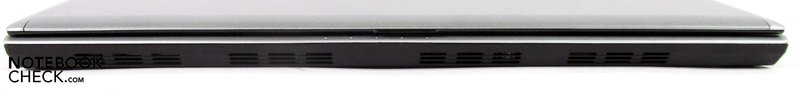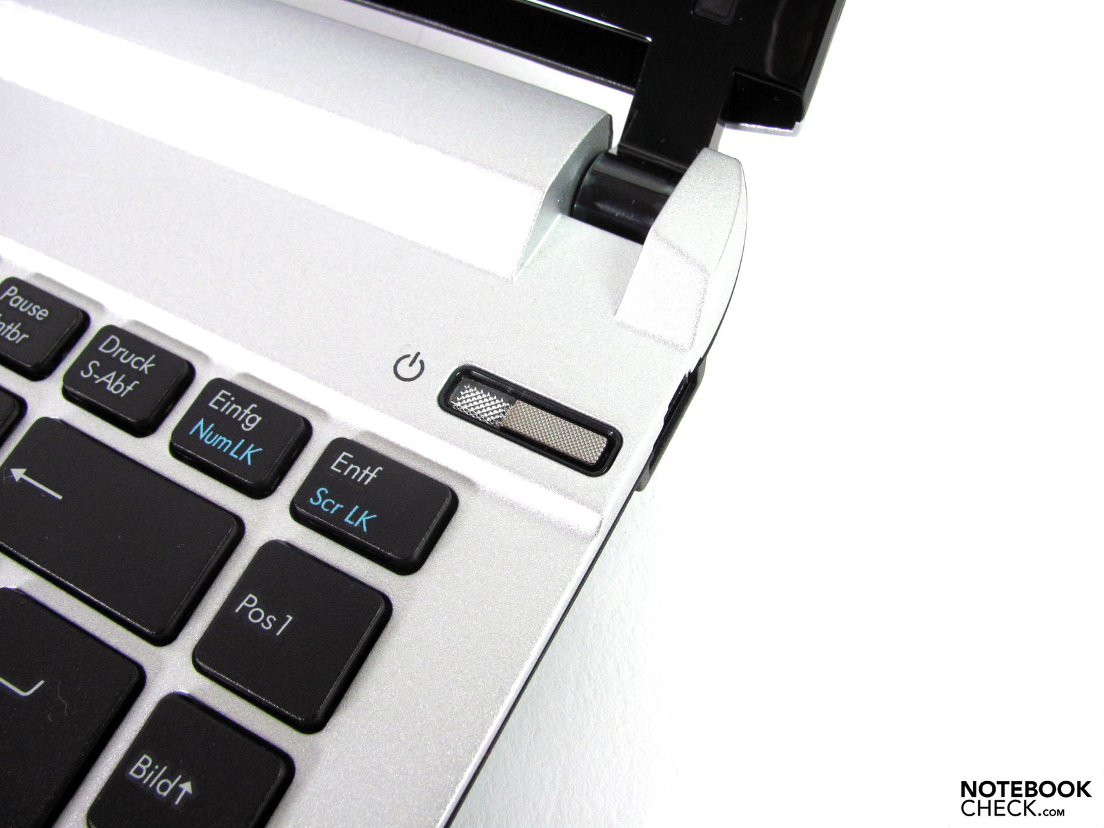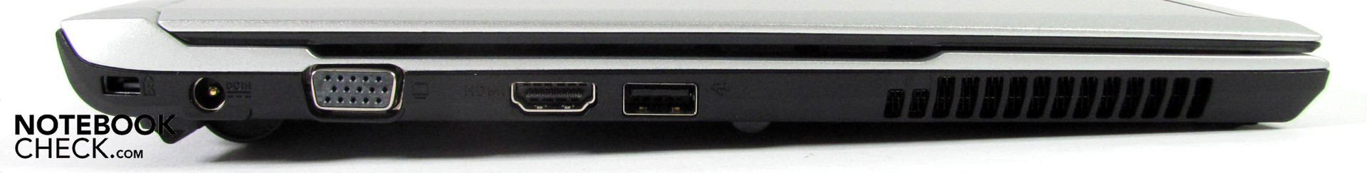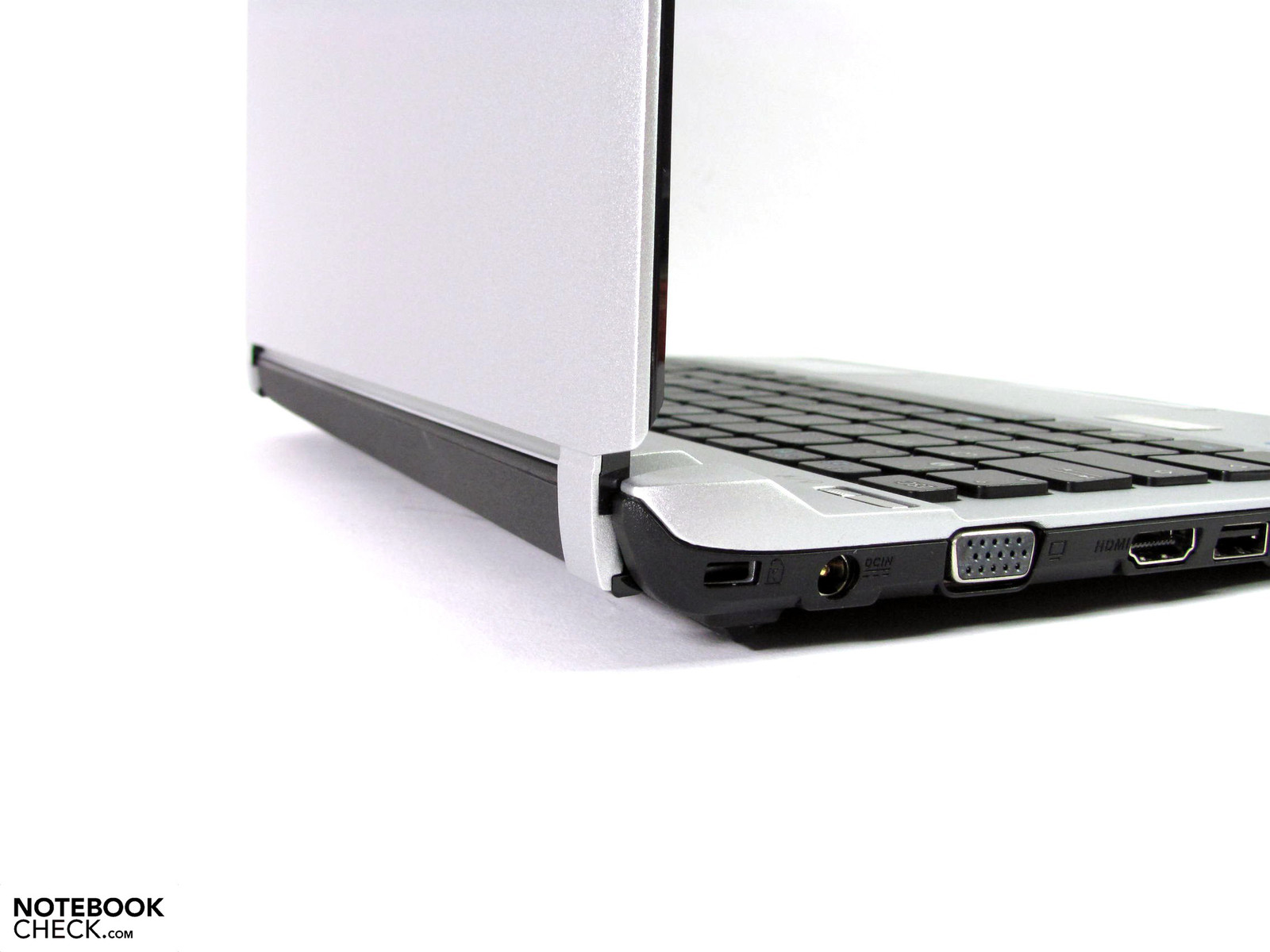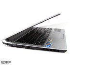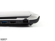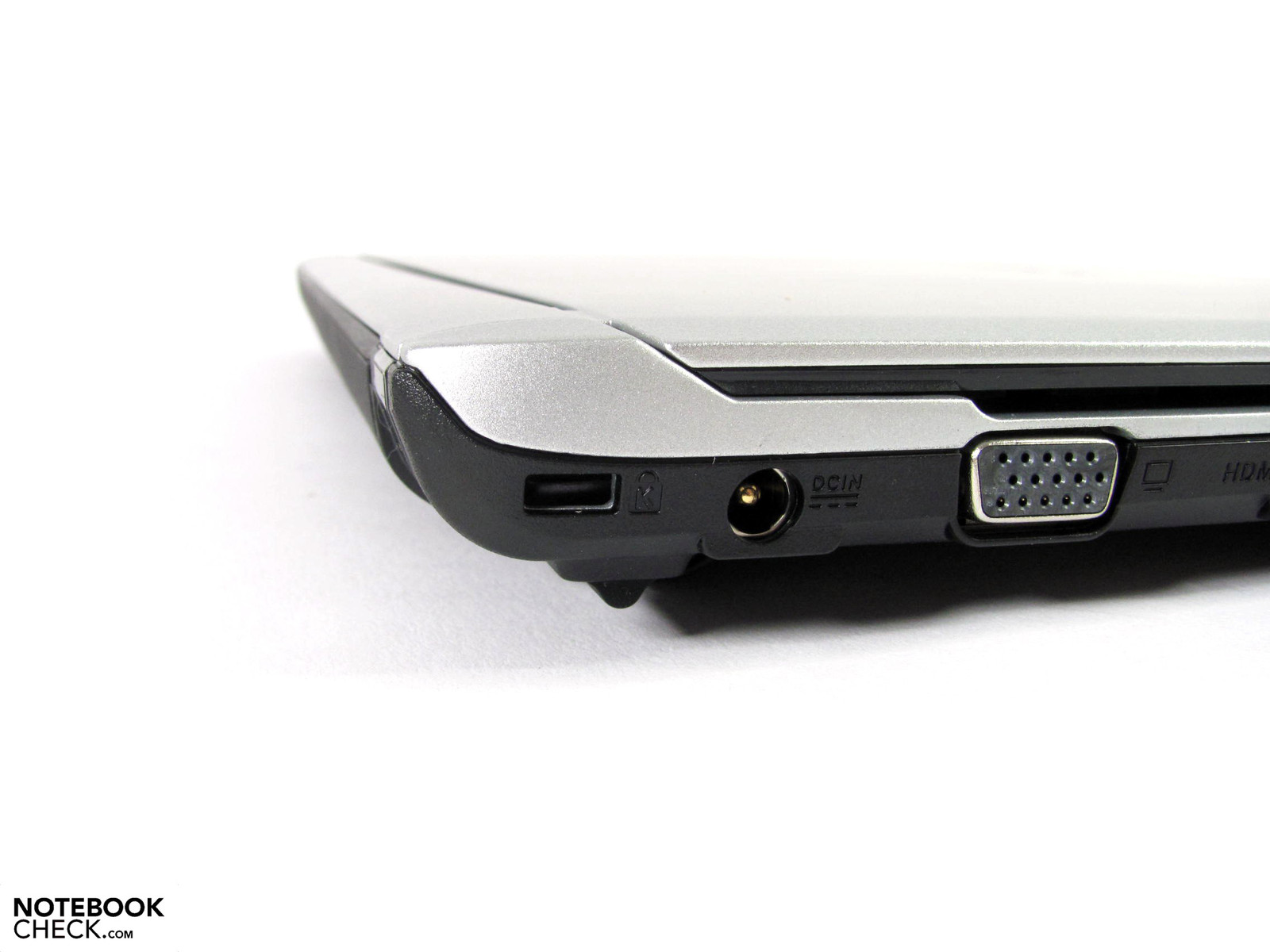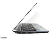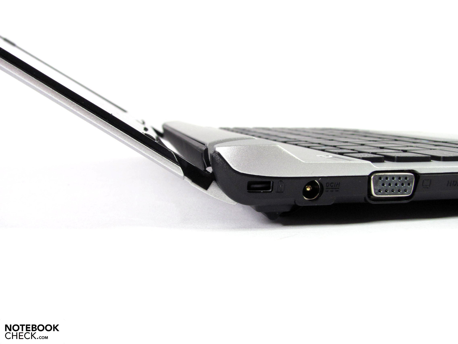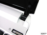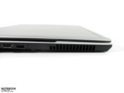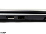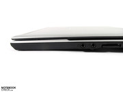 Obviously, the attempt of placing the ports in the back part of the sides has been successful. Thus, an almost conflict-free work zone has been created. Merely the audio port on the right might get in the way of using a mouse when cables are connected, in particular for right handed users. The power cable is angled and can therefore nicely disappear towards the rear.