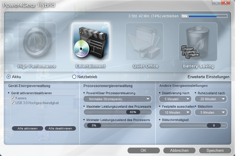 Asus has extended the energy saving profiles, known from Windows 7, by its own (Entertainment, Quiet Office, High Performance and Battery Saving). They can be easily switched via the Power4Gear button. Moreover, Nvidia's Optimus has its fingers in the pie and switches automatically between Intel and Nvidia graphics, depending on the application. You can intervene in both technologies and adjust the settings to suit your personal needs.