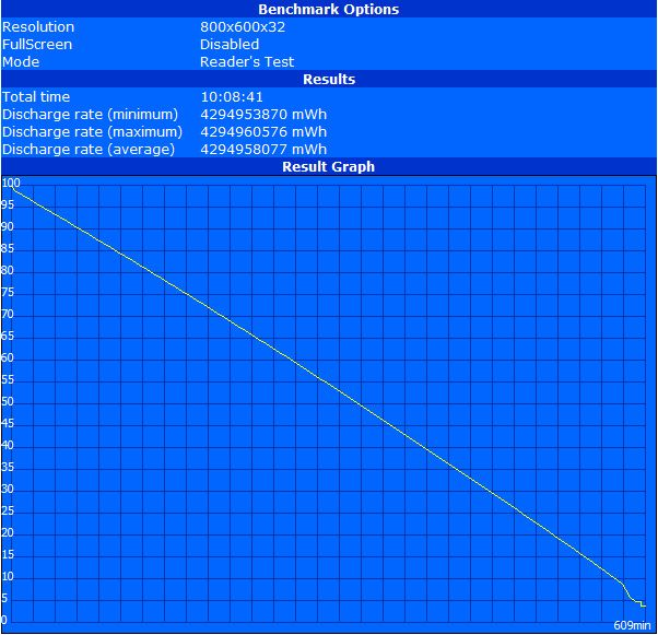 With the right setting ("maximum battery life" – graphics clocks down to a minimum), a considerably better runtime of 609 min can be reached with the Intel HD graphics. Thus, Asus also keeps its promised theoretical battery life 10 hours.