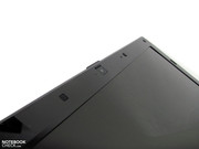 The base plate and display are joined by a currently modern hinge design, flange-mounted on the rear, which does its job well. The display only starts to teeter during strong surface movements. A drawback of this build is that the rear has to be exempted from interfaces. The display is kept well in position in a closed state. However, the sides that don't close flush could be a problem since foreign objects could penetrate through the gap, between display and keyboard. Although the display lid has turned out very thin with a thickness of 2-4 mm, it is remarkably robust. It can be bent by pulling and twisting at its corners, but isn't at all inferior in comparison with the majority. Nevertheless, image distortions perceived as wave development can be provoked with medium pressure on display lid and display bezel.