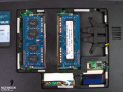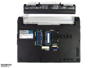 The bottom also makes a very robust and resistant impression. The RAM can easily be replaced via the centrally located opening. If you have to access the mass memory, you will have to penetrate even further into the case and thus remove the bottom tray. The battery fits tight in its intended compartment and can be secured additionally. Our model, with an 8 cell battery, weighs 1.69 kg and is jacked up a bit at its rear. An alternative with a 4 cell battery allegedly only weighs 1.44 kg and delivers the promised case height of 19 mm. Contrarily, the test device reaches a height of 30 mm at the rear and even without the battery the advertised 19 mm are surpassed with the rubber feet. So, this is only actually reached at the front. Otherwise, the case width of 322 mm and depth of 232 mm aren't record-breaking, but in comparison to other 13" components quite impressive.