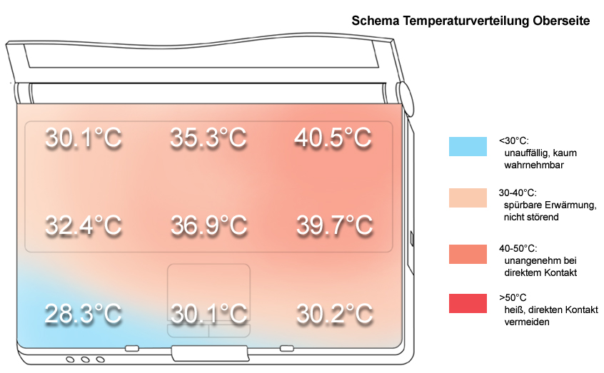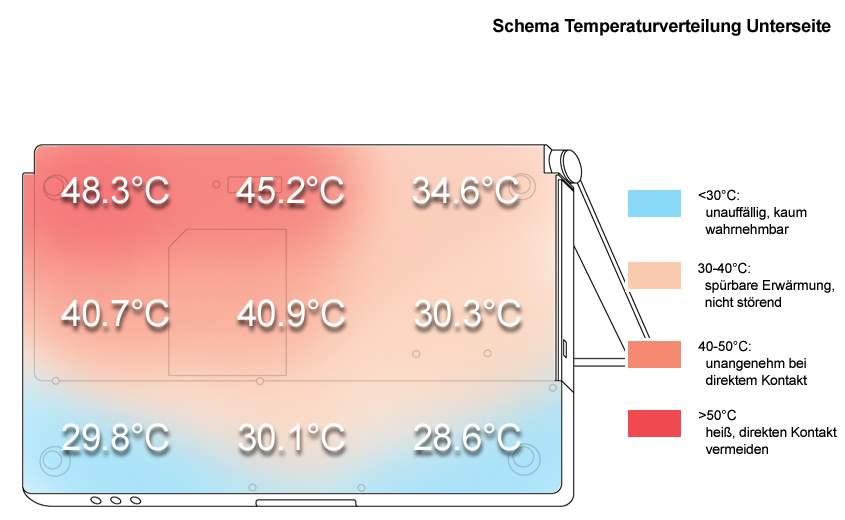 While the noise emissions are low, the notebook clearly gets warmer. Especially for a subnotebook, surface temperatures of up to 48°C cannot be neglected.