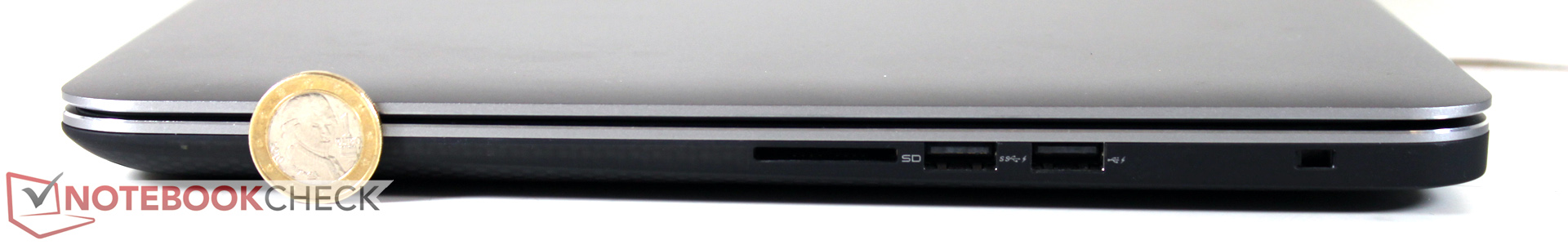 A thin chassis has advantages as far as mobility and looks are concerned, but port availability and distribution is usually less than ideal. The new XPS 15 lacks an optical drive as well as a RJ45 LAN port, but it does come with a Mini DisplayPort, 3x USB 3.0, USB 2.0, HDMI, and a SD card reader. We appreciate the fact that the USB ports on the left and right edge are located towards the rear of the unit; the other ports are pretty far from the front, so cables can be routed without getting in the way.