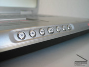 The implemented keyboard has a soft stopper and can be handled pleasantly. It offers normal large keys with a good layout (e.g. normal large enter key). Only the function and arrow keys are processed somewhat smaller. The high (however flattened) edge of the chassis is somewhat uncomfortable during longer writing. Additionally the XPS M1710 offers multimedia keys at the front.