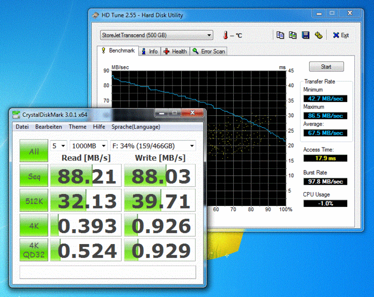 As mentioned in the beginning, the Fragbook can accommodate a maximum of two hard disks (HDDs, SSDs or hybrid models). Deviltech installed a 500 GB HDD from Samsung, model HM500JJ, into our test sample. The performance is on a fairly good level not least due to its fast speed (7200 rpm). We could determine a transfer rate of 86.6 MB/s and an access rate of 15.5 ms with the tool, HDTune.