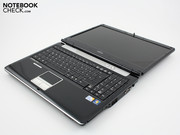 The inside surfaces of the laptop and the whole of the lid are covered in a scratch-resistant, glittery finish. In daylight the metallic shimmer turns into an outright glamour effect. But it still fails to look classy, in our opinion, as the clunky case details can't help but put you in mind of a laptop from the 90s. The lid can be opened with one hand, thanks to the heavy base unit. The hinges are firm, so that the lid barely wobbles when adjusted. The notebook can be opened to a maximum angle of slightly more than 180°, which is excellent, and unusual for a notebook these days. The lid's surface does pick up fingerprints all over. It also flexes noticeably when you apply pressure to it. However, the lid is so thick that this does not immediately lead to dark spots on the screen itself.