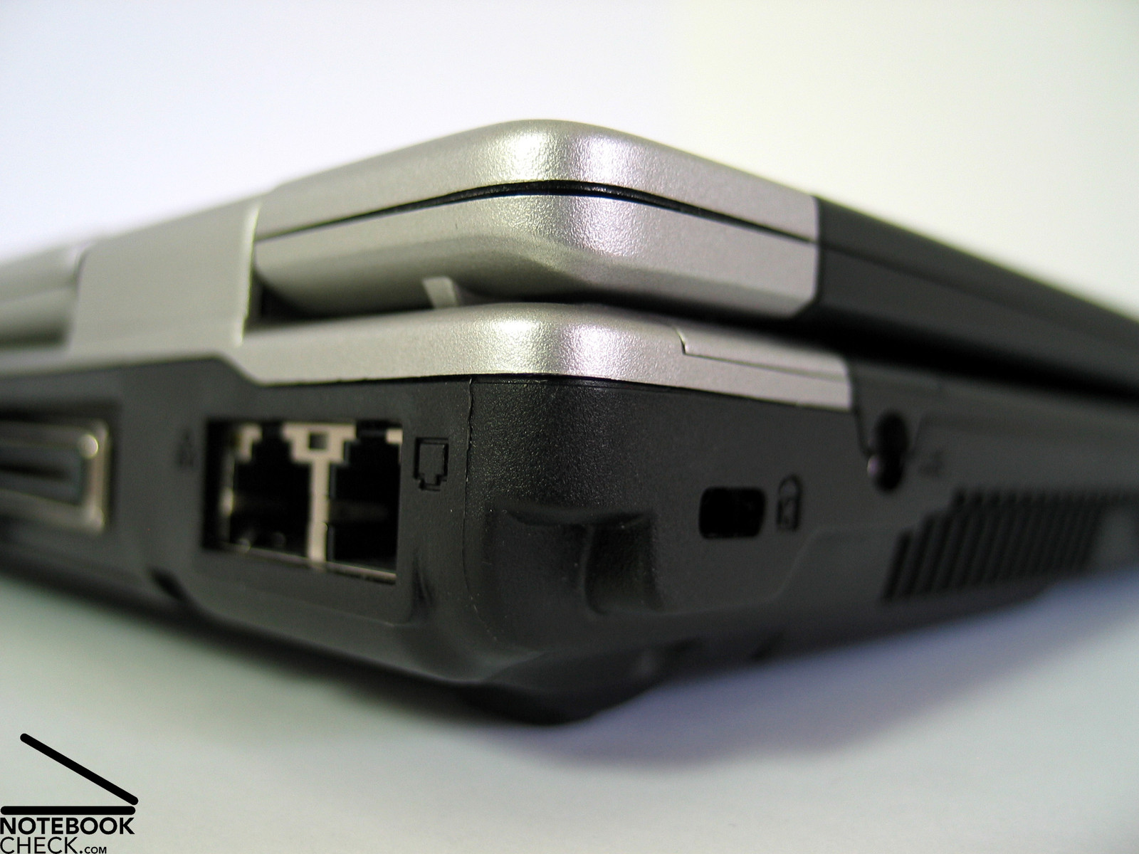 At the front side there are a Fast IrDa 1.1 Port with a transfer rate of up to 4 Mbits, a 3in1 Cardreader and both of the audio ports (microphone, headset). At the left side there are from front to back: a PCCard Slot (Typ I and II), S-Video and VGA out, the vent holes, the power connector and totally at the back a Kensington lock.