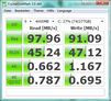This rate was not quite reached with CrystalDiskMark 3.0. The test delivered an average read rate of 97 MB/s and write rate of 91 MB/s during the course of nine sequential runs.
