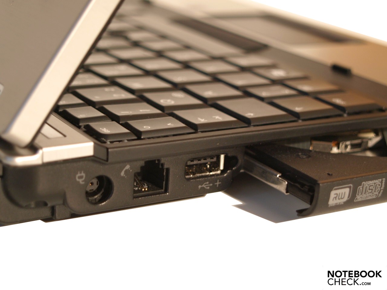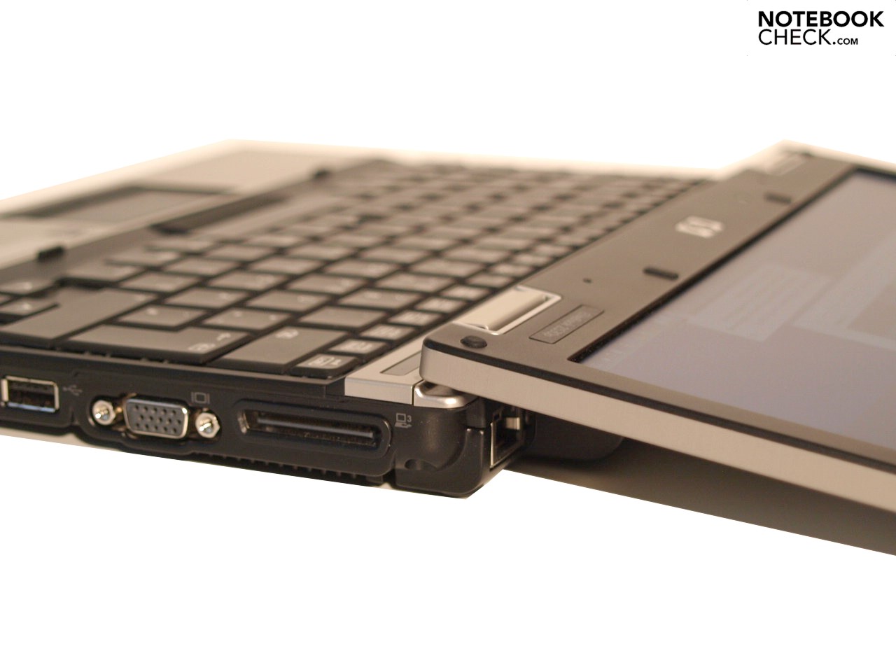 Only the most necessary ports have been included, most likely due to lack of space. Our test model has two USB 2.0 ports, VGA output as well as LAN and modem ports. Models without the optical drive get a third USB in its place. If you need more than this, HP offers a compatible docking station for 254 Euros (2400/2500 series - EQ773AA). It makes it easier for you to slot into an existing work environment, and it extends the selection of ports by four USB 2.0s (one of which is a Powered USB), and ethernet pass-through, S-Video and VGA ports.