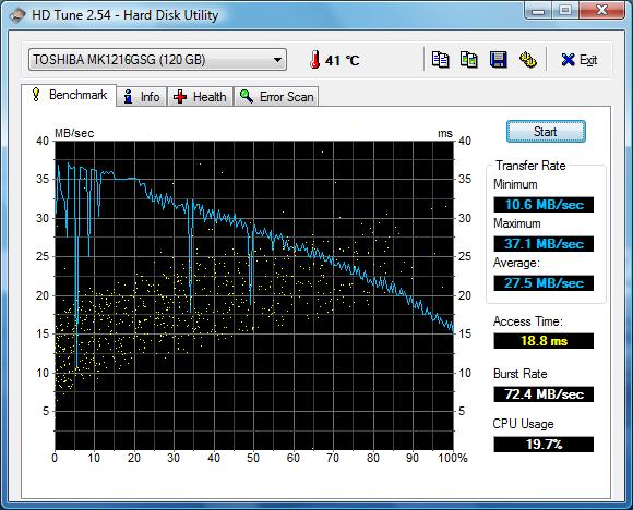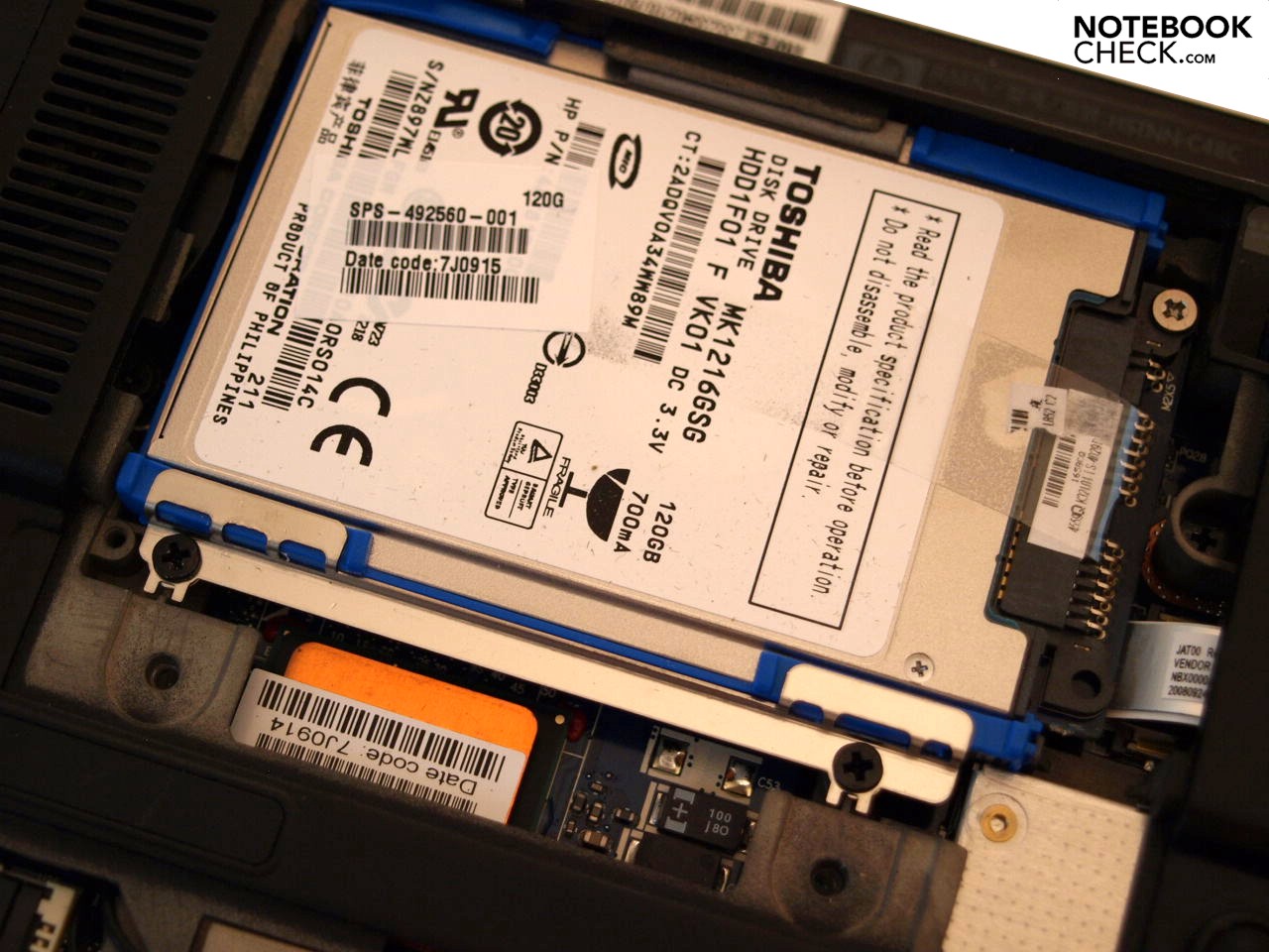The 2530p has a conventional hard drive, a Toshiba MK1216GSG, with 120 GB total capacity and 5,400 rpm. It delivers average scores in the HDTune benchmark test. HP kits all its models out with conventional hard drives of various sizes with either 5,400 or 7,200 rpm, and they are all protected to some extent against shock. HP's so-called 3D Driveguard technology combines an accelerometer, which detects sudden movements and parks the hard drive, with a particularly cushioned and impact-resistant hard drive mounting. The 2530p is also available (at least in the US) with an 80 GB SSD, but whether this version is or ever will be available in Germany is unclear, with the specifications merely reading 'serial ATA hard drive 80, 120 or 160 GB, 5400 rpm'.