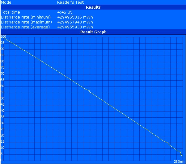 The six-cell, 55 Wh battery in our test model achieved a maximum possible run time of 287 minutes in our BatteryEater Readers Test (with all energy-saving options selected, minimum screen brightness, and WLAN and Bluetooth off). Under heavy use in the BatteryEater Classic Test it lasted only 111 minutes.