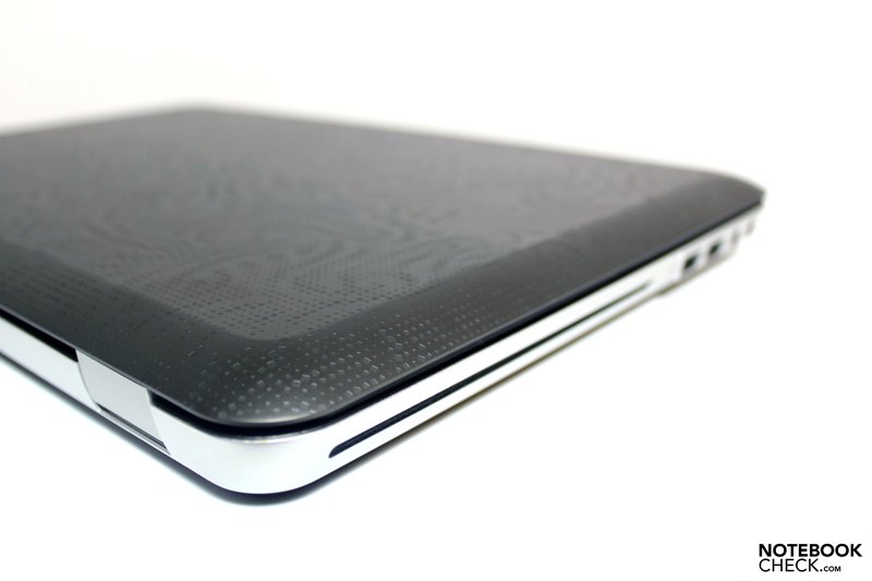 Nevertheless, a significant factor of the metal case (aluminum/magnesium) is its excellent stability. There is neither a noteworthy denting possible on the base unit, no matter if on the bottom or upper side, nor in the vicinity of the optical drive, or on the display lid.