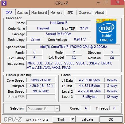 The Core i7-4700MQ (2.4 GHz) as used in the Envy sibling HP Envy 17t-j003 has been quite the vulgar processor, being a true quad-core with a TDP of 47 watts instead of the much more "sexy" 17 or 15 watts which Intel has worked so hard to achieve. Things have changed in the case of the i7-4702MQ (2.2 GHz), with the TDP being decreased to 37 watts, being accompanied by a 200 MHz decrease in terms of clock speed. With Turbo Boost, up to 3.2 GHz can be achieved (4700MQ: 3.4 GHz).