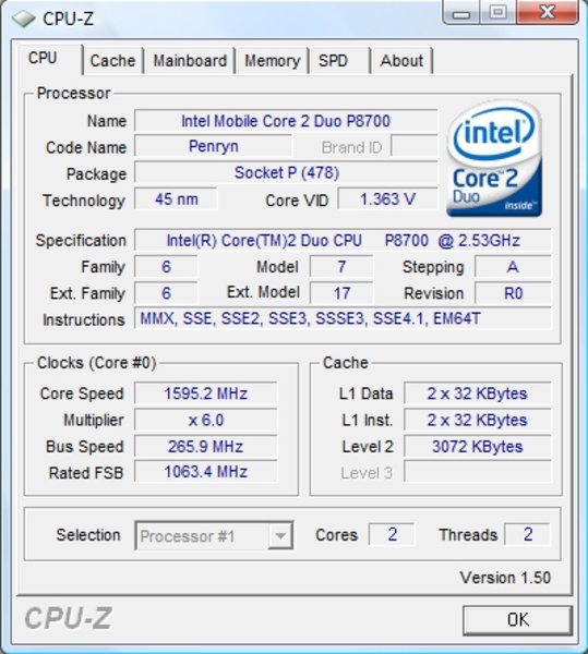 When it comes to the employed CPU, the 45 nanometre technology is used for the Penryn range chip. As a representative of the P-series the processor makes do with a TDP of merely 25 Watt, compared to the Txxxx models running at 35 Watt. The further benchmark data like the clock speeds of 2.53 GHz, 1066 MHz front-side bus and 3MB L2 cache certify the CPU's good performance reserves. At a price of 241.- US Dollars the chip is comparatively low priced, and only marginally more expensive than the slower representative of the Pxxxx series from Intel.