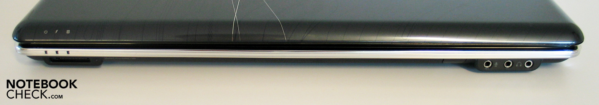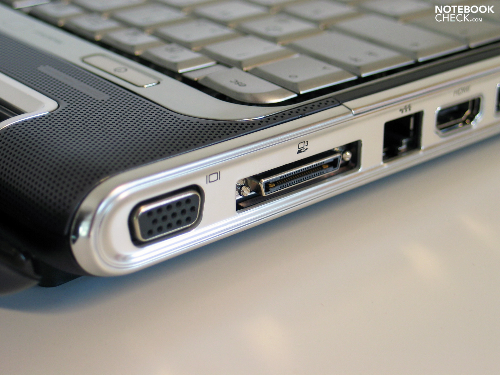 The HP Pavilion HDX16 secures its status as a multimedia laptop amongst others through its interfaces on offer. Bordered by chromed plastic you'll find on the right hand side a VGA port, a connection for a docking cable, LAN, HDMI, eSATA/USB, a further USB port, FireWire and an ExpressCard slot. HP places the obligatory cardreader and the audio jacks on the leading edge of the laptop.