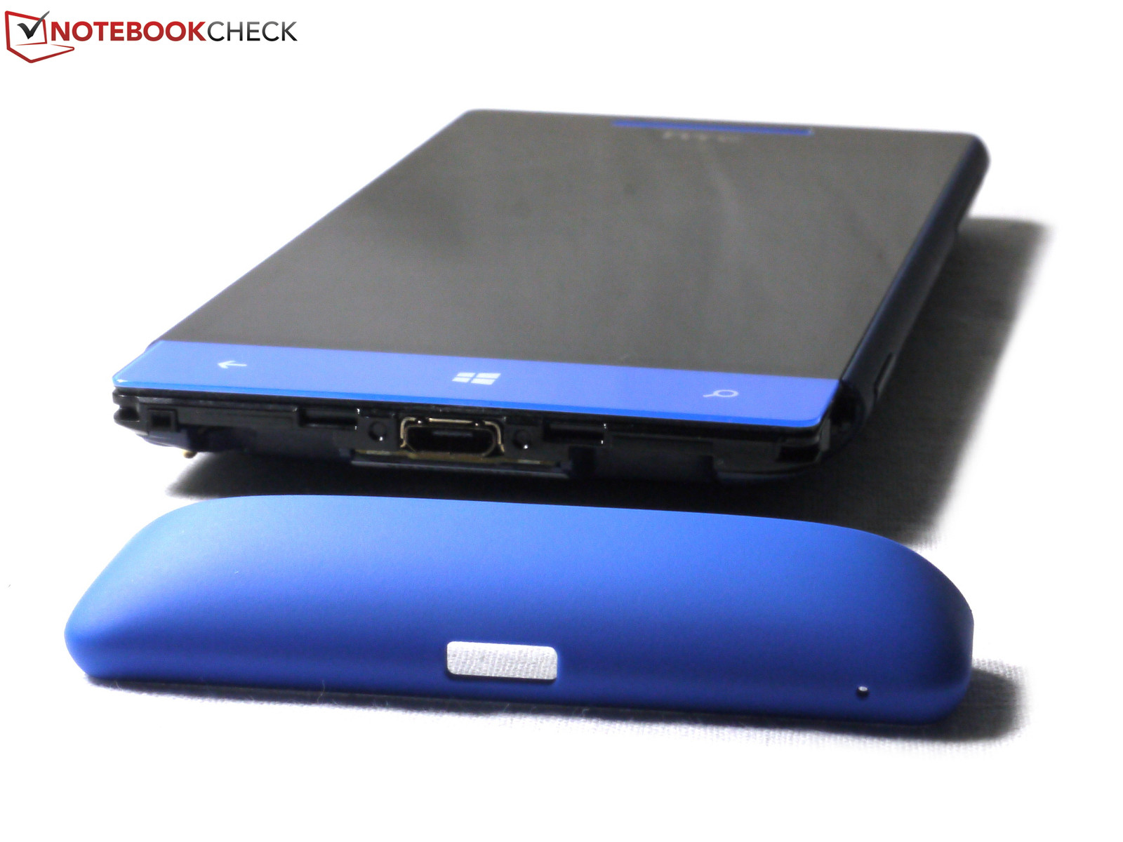 A special feature of the Windows Phone 8S is the different case colors which always consist of two colors. Available case colors are Domino, High-Rise Gray Yellow, Fiesta Red and Atlantic Blue from our review sample. Below the display are capacitive buttons whose background is either colored light or bright. The detachable cover on the back gives access to the micro SIM and micro SD card slot and also continues the color scheme. The rest of the case consists of one piece of polycarbonate in a subtle color under which the built-in battery is located. Despite the lack of an aluminum case the 8S does not feel cheap. Thanks to HTC's proven Unibody-design the build quality and the stability of the smartphone are good.
