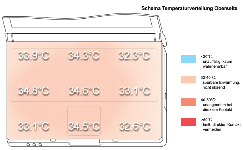 During idle mode the notebook stays relatively quiet. The measured noise level of 35.3dB is caused by a whirring which can sometimes be heard next to the fan. This got especially evident during battery operation. The hard disk deserves special mentioning, because it could even hardly be heard, if accessed.