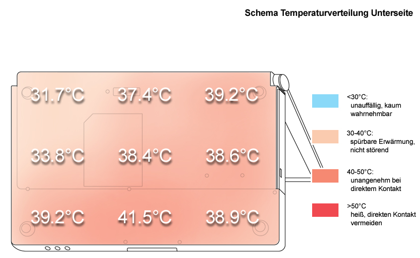The temperature emissions are low. Despite the fan often ran during our tests, in total it is not really evident and hardly disturbing.