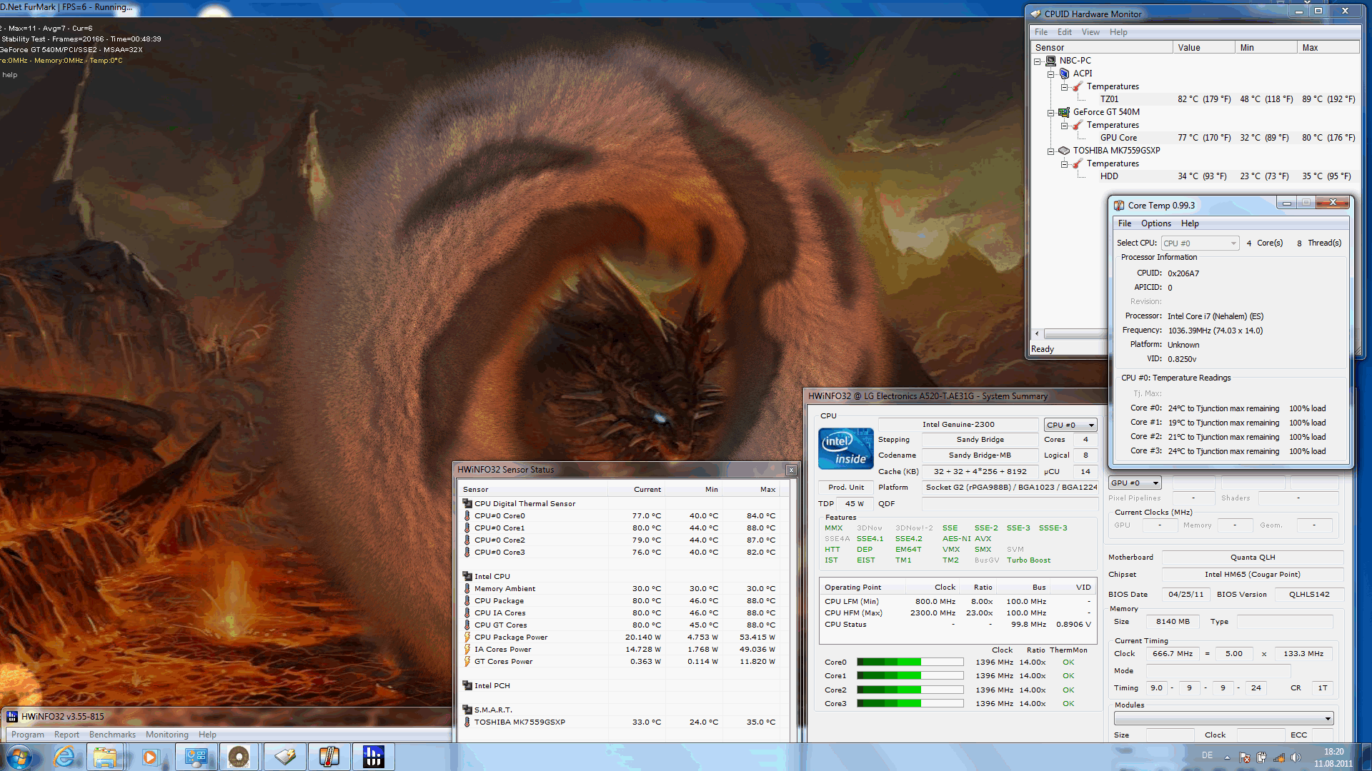 The stress test is the opposite (Prime95, Furmark) and is 84 watts. This power consumption isn't enough for the 45 watt quad CPU, 2820QM, and the GT 540, which we explained in CPU throttling in temperature. The reason is the weak 90 watt power adapter. The Fujitsu NH751, with a smaller quad CPU (2630QM) and a GT 525M graphics, is equipped with a 120 watt power adapter to begin with (no throttling). This would have at least been needed for the LG A520.