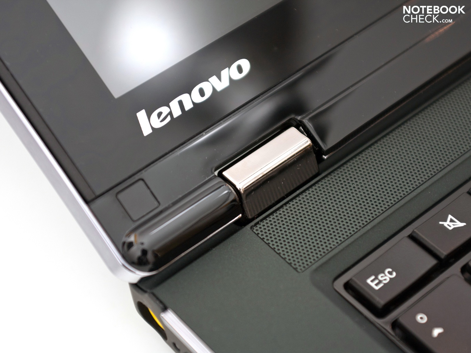 The ThinkPad's virtually famous case presents itself in a basic, matt black. In contrast to the ThinkPad Edge 15, the new E series looks more up to date and moves, even if only slightly, outside of the familiar line. The best example for this is the decorative metal strips that run around the case. They were usually matt and made of plastic in the past. All surfaces are still made with the haptically pleasant and velvety soft touch texture, which is however fairly susceptible for grease stains and dust. The workmanship basically makes a high-end impression and weak points were avoided by using a slot-in drive and omitting a maintenance cover. Another optical advantage is the lack of status LEDs. Merely the ThinkPad logo's dot over the "i" is illuminated in red during operation.