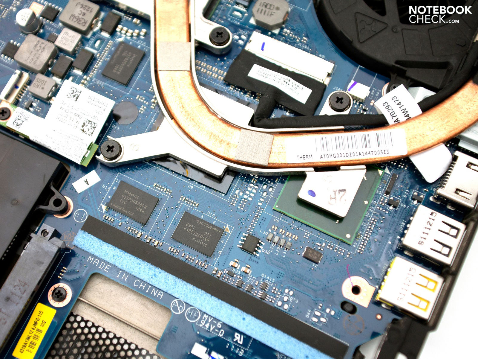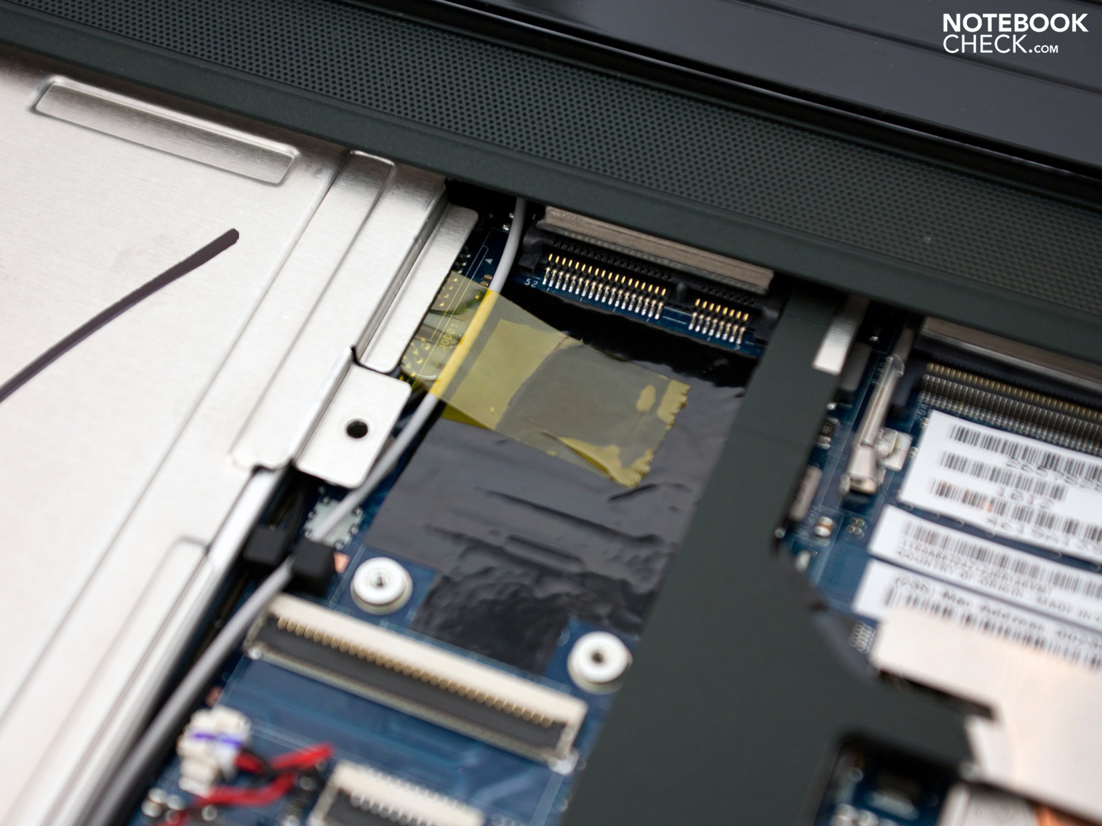After removing two marked screws on the bottom, the entire keyboard can be pushed towards the back and thus allows access to the components. The empty slot for additional two or four DDR3 RAMs is important here. The memory medium is located at the side and can be reached even without taking the keyboard apart.