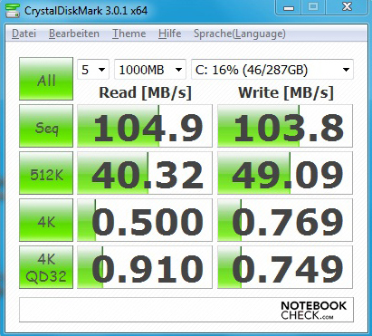 Lenovo uses a slim Seagate Momentus Thin with a construction height of 7 millimeters for the hard disk. A drawback of this solution is the restricted availability of stronger alternatives. The HDD's performance doesn't have to hide with a maximum transfer rate of 107.1 MB per second the in HDTune Pro benchmark. The access rates are also on average. Intel's SSD series 510, or the OCZ Vertex 3 as a modern solid state drive unfortunately doesn't fit into the HDD slot.