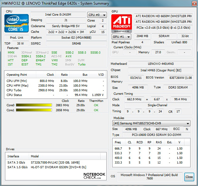 The latest hardware shouldn't be omitted in a newly released notebook of 2011. Lenovo also relies on the Intel Sandy Bridge CPUs and a matching graphics. Depending on the model, the ThinkPad Edge is equipped with either the entry level CPU, Intel Core i3-2310M, or the stronger Intel Core i5-2410M. We've tested the latter with a clock rate of 2.3 GHz and a 3 MB L3 cache. The processor is a favored component for multimedia notebooks due to the Hyper Threading technology (2 cores, 4 threads) and a maximum clock rate of 2.9 GHz via Turbo Boost 2.0.