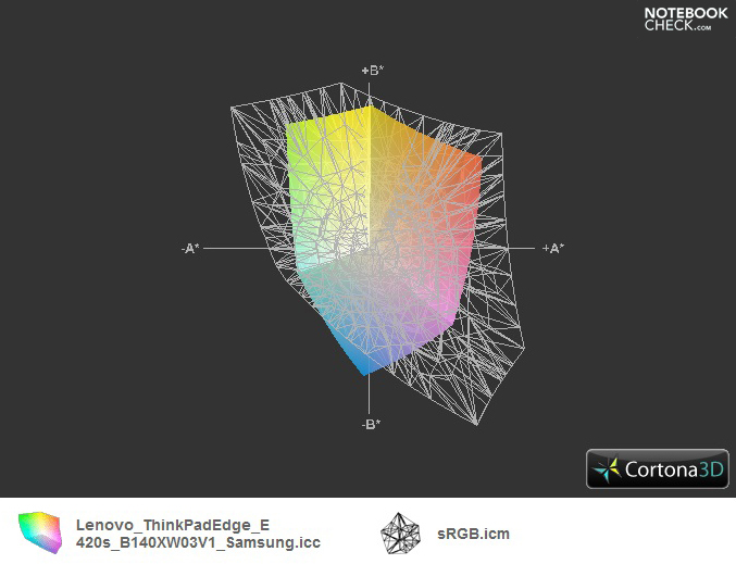 The ThinkPad Edge E420s doesn't come close to covering the frequently used sRGB color spectrum and thus the display isn't suitable for professional users (picture editing).