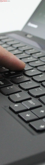 The touchpad has seen some changes as well. It is now 70 x 100 mm large (~2.8 x 3.9 inches), with the two touchpad buttons having been removed, at least physically. Still, the click zones have remained the same as before. The touchpad offers a generous 2 mm of travel, with even responsiveness throughout (while many consumer touchpads offer no travel at all in their upper third). Lenovo calls this a glass surface, but while the matte surface feels hard and premium due to its non-glossy coating, it does not feel cool. It works flawlessly, allowing for quick and responsive reactions of the device. Many professional users will prefer the red TrackPoint, but some of them are going to miss the real, physical buttons, as they felt a bit faster and more responsive than the touchpad of the 2014 edition.