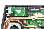 The cover is very thin and feels easily breakable -- caution ought to be exercised in handling it. Once removed, you have access to the fan, the WLAN module, the hard drive and the memory banks. One of these banks is open, so the RAM can be easily expanded to 16 GB. Unlike in the Deviltech Fire DTX, which is built with the same barebone, there is no mSATA connection on the motherboard. Anyone who wishes to install an SSD will have to remove the notebook's HDD.