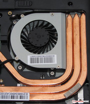 The big maintenance hatch allows access to the main memory, the hard drive, the WLAN module, the BIOS battery, the CPU and the fan. Two main memory banks are installed in the GP60. One bank is occupied by a 4 GB module. Exchanging the hard drive is easily done. 2.5-inch hard drives with a design height of either 7 or 9.5 mm can be used. The fan could be removed for cleaning purposes. Changing the processor would also be no problem because it rests on a pedestal. MSI economized the mSATA slot, which is installed in the GE60, but not in the GP60.