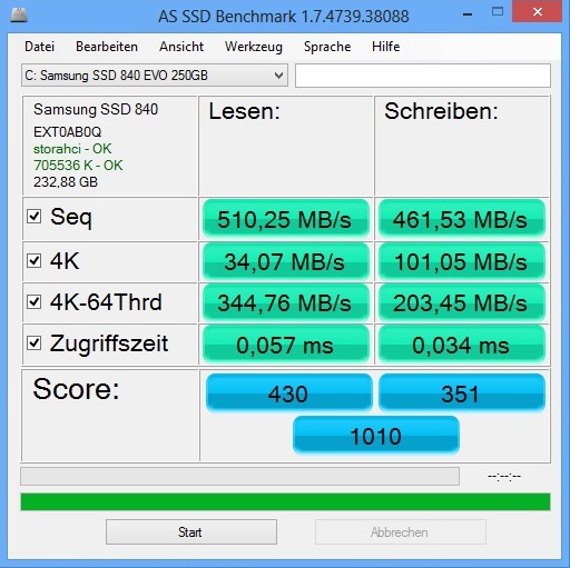Indeed, the SATA III model reaches superb transfer speeds during the AS SSD benchmark, with sequential read and write speeds of 510 MB/s and 462 MB/s, respectively. This is better than the 500 GB Crucial M500 (480 MB/s and 413 MB/s, Schenker XMG A523).