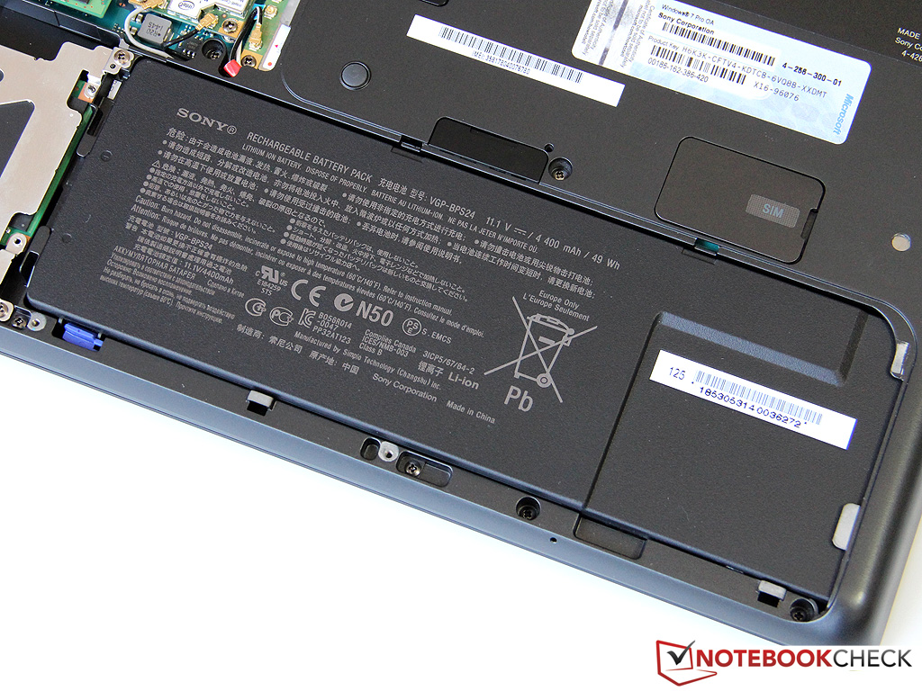 The Vaio’s built-in battery has a rated capacity of 49 Wh. Sony advertises a 6 hour runtime for the battery that can be extended up to a maximum of 12 hours using the optionally available battery slice. Unfortunately, we were unable to obtain the latter for our test.