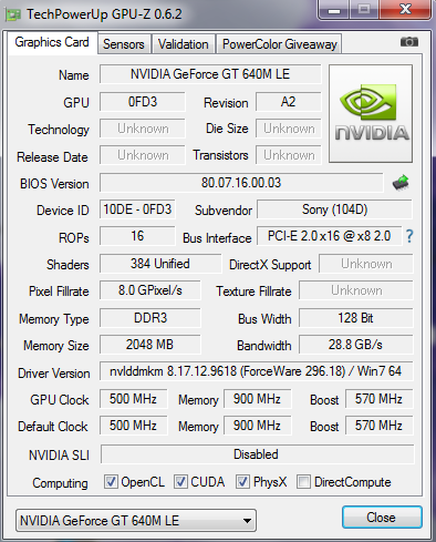 The Nvidia GeForce GT 640M LE which serves as the SV-S13A’s GPU is new for us as we have only previously tested the regular GT 640M. It appears the only difference between the LE version and the standard version is a somewhat lower core clock frequency of 500 MHz with a 570 MHz Turbo speed as compared to the GT 640M’s 625 MHz base clock and 709 MHz turbo clock. Both cards are based on the 28 nanometer Kepler GK107 chip which features 384 shader units and DirectX 11 support. The GT 640M LE comes with 2 GB of DDR3 VRAM in a 128-bit memory interface which should be more than enough even for demanding 3D games and applications.