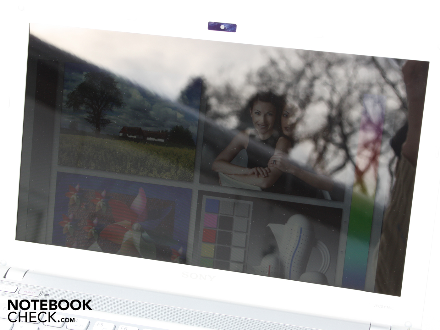 Sony builds in a 13.3 inch display (33.8 cm) with a resolution of 1366x768 pixels (16:9). The reflective screen (type unknown) can't convince us. The brightness is average, the contrasts are poor and the color space is very small.