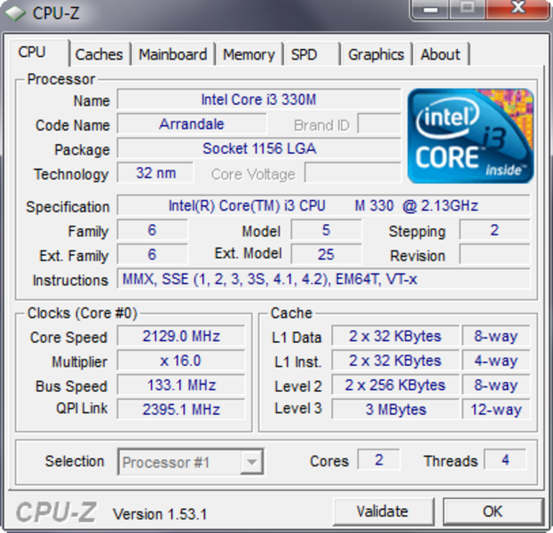 The Intel Core i3-330M processor belongs to Intel's weakest Arrandale processors with 2 x 2.13 GHz. The TDP is, as in the related model i3-350M (2.26 GHZ), 35 watts. So it's not an energy savings ULV CPU as they are, for example, used in Acer's Timeline series or Asus' UL series. The i3-330M has an integrated IGP graphic unit, just like the stronger i5-520M. The Intel HD has been, however, disabled by the OEM supplier. The image is rendered by a dedicated Nvidia GeForce 310M (512 MB GDDR3) instead.