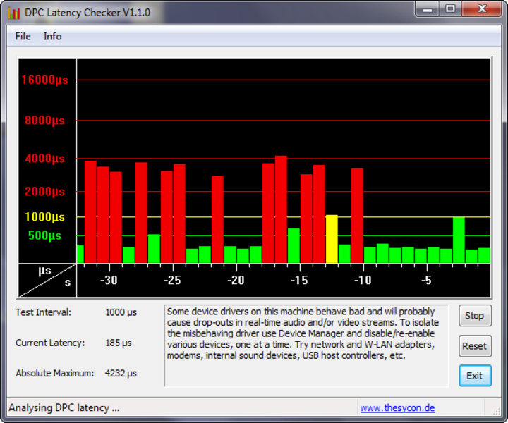 Latencies are delays that can turn up in interaction of internal devices. If these are too high, it can come to problems when external devices are connected (e.g. sound crackling with external sound cards or short interruptions in real time audio). The rates of the S11 are continuously a bit below 4000µs when the hard disk and programs are active. The cause for this is erroneous drivers of internal devices, such as the WLAN adapter, sound card, USB host controller or others. Disabling these one at a time can reveal the faulty driver.
