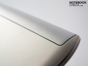 In our opinion, the lid is adequately stiff in view of its slim design. We can only twist the lid by a few degrees when it is picked up at the corners. Slight pressure on the display surface didn't provoke instant deformations. Both hinges, where the display is mounted, are a bit loose. But the display stays securely in every position, anyway. The lid teeters a bit under jolts, as they partly turn up in train or car journeys.