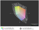 We determine a contrast of 138:1 with a weak black value of 1.85 cd/m2. Higher contrasts equal bright, fresh colors. Colors look pallid and bleached. The color spectrum can't even be called that as the measurement with the colorimeter, X-Rite i1Display, illustrates. AdobeRGB (t) and sRGB(t) are missed by lengths. The high quality 15.6 inch consumer screen as in a Vaio EB4X (FHD) or even a Vaio F21E/B can reproduce a significantly larger color spectrum.