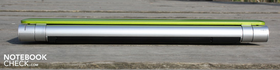 The green, flat lid is adequately stiff. We can only twist it a bit when we pick it up at the corners. The manufacturer has improved the compressive strength of the lid surface. It can only be dent with considerable force. Due to the slight thickness, pressure points turn up immediately on the screen.