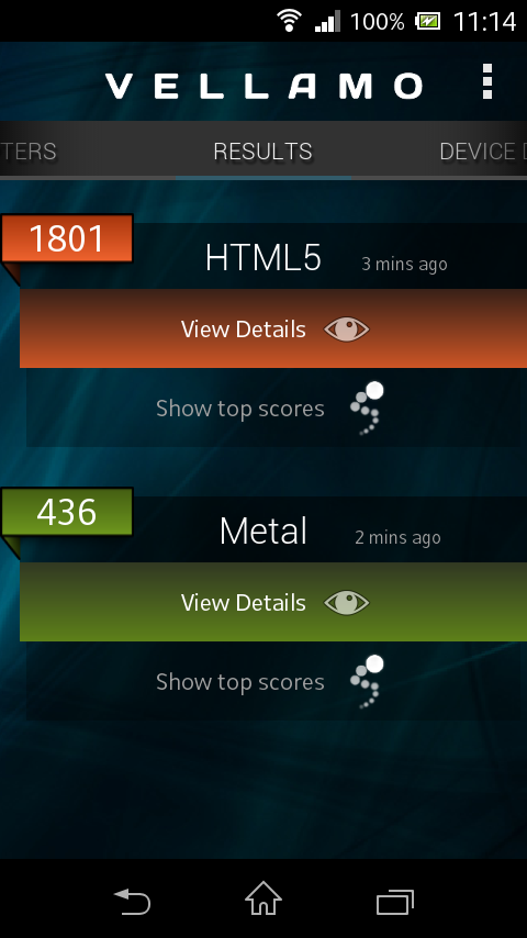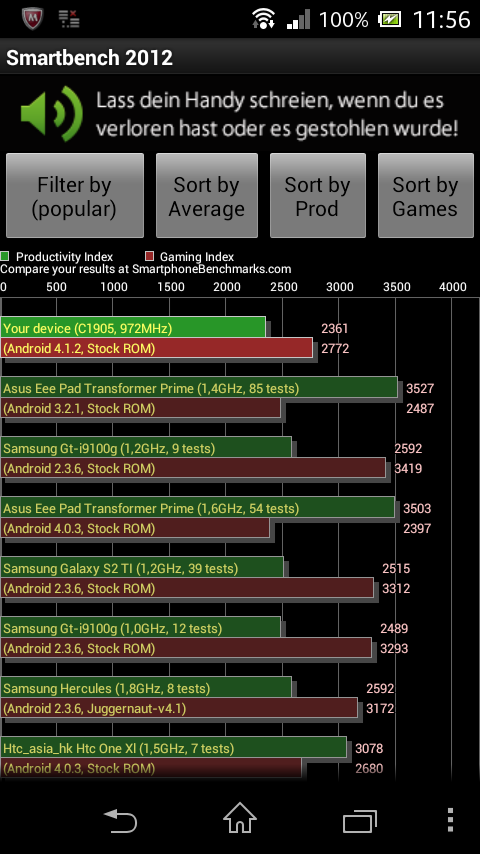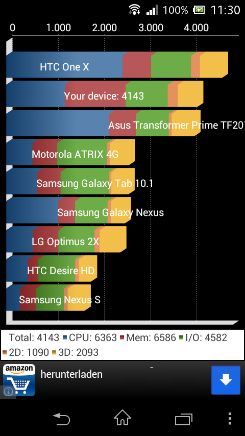 The CPU's performance level lags behind the competition. This is primarily due to the somewhat lower clock rate. The graphics potential is, however, much higher in the Xperia M and it proves that in the GFX benchmark. The identically equipped Windows phones from Nokia and HTC unfortunately do not have an analogous comparison platform so that a direct performance comparison is not possible.