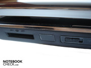 There is a 5-in-1 cardreader on the front, which is proficient of SD, MS, MS PRO, MMC and XD formats. Adjacently, there is an inconspicuous infrared sensor and a slide control for activating and deactivating the integrated WLAN (802.11 a/g/n).