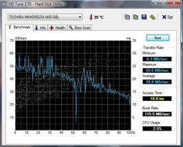 A hard disk with a capacity of 400 GBytes and 5400 rpm is used as the mass memory. We assessed its results with the HDTune tool. Whilst the throughput rate of 115.5 MB/s is still acceptable, the other results turn out rather disappointing. Hence, the access rate is a high 18.8 ms, the transfer rate remains to be meager with an average of 39.8 MB/s. Toshiba has divided the hard disk into two almost equally large partitions with about 186 GBytes each ex-factory.