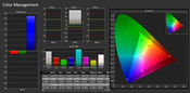 Depending on the brightness setting the Gamma value is between 1.8 at 10% brightness and the target value 2.2 at maximum brightness. The calibration shifts that to 1.9. The saturation is too weak. Far off the DeltaE of 5 are blue, green and red. The blue cast is a disadvantage of many displays equipped with White LEDs. Discrepancies become visible to the human eye with a DeltaE value of 3 and more. With the calibration the saturation gets considerably better but the blue cast remains.