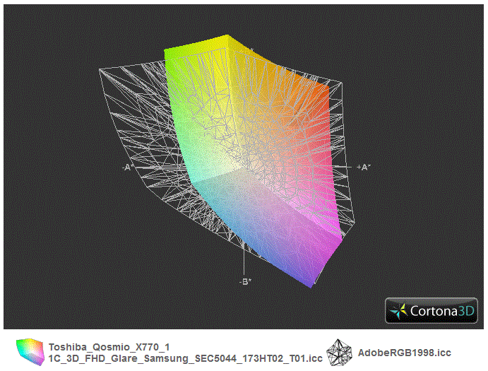 Does the Full HD panel cover the professional sRGB color room? The 3D panel comes close to covering the sRGB color room. On the bright side, the display can show more colors in the yellow region. The HD+ version (X770-10J and other models) beat the FHD panel of our test model clearly: the color grid covers more area (see the third picture). The gaming flagship of Asus, the G74SX-3DE, is slightly better in this area.
